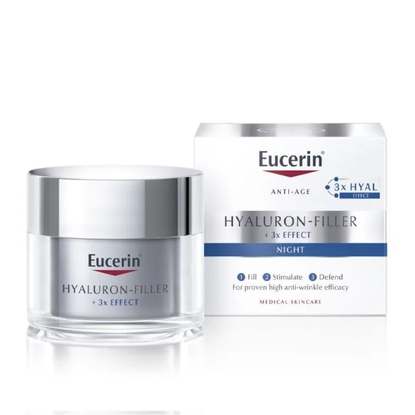 Eucerin Hyaluron-Filler Noćna krema utiče na prve znakove starenja. Ona vidljivo popunjava fine linije i duboke bore za podmlađen izgled a u isto vreme stimuliše regenraciju kože.