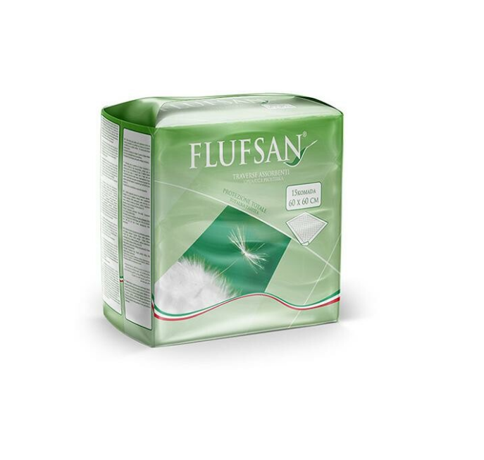 Flufsan nepromočivi podmetači sa upijajućim slojom napravljenim od čiste celuloze pružaju validnu zaštitu za probleme inkontinencije i sprečavaju iritaciju kože. Dimenzije 60cm x 60cm.