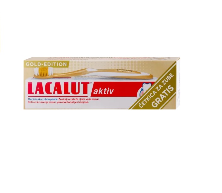 Lacalut Aktiv pasta aktivno deluje protiv krvarenja desni, umiruje upalne procese desni i štiti zube od nastanka karijesa. Sadrži aluminijum laktat i aluminijum fluorid, uz dodatak hlorheksidina, alantoina i bisabolola. Aluminijum laktat zaustavlja krvarenje stezanjem desni, aluminijum fluorid deluje antikarijesno, hlorheksidin diglukonat antiseptički, a bisabolol i alantoin protivupalno i umirujuće.